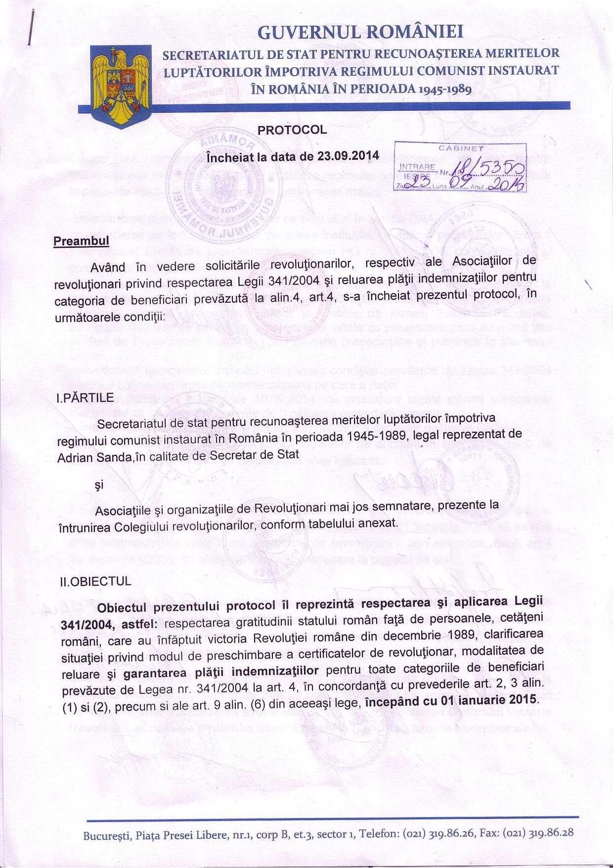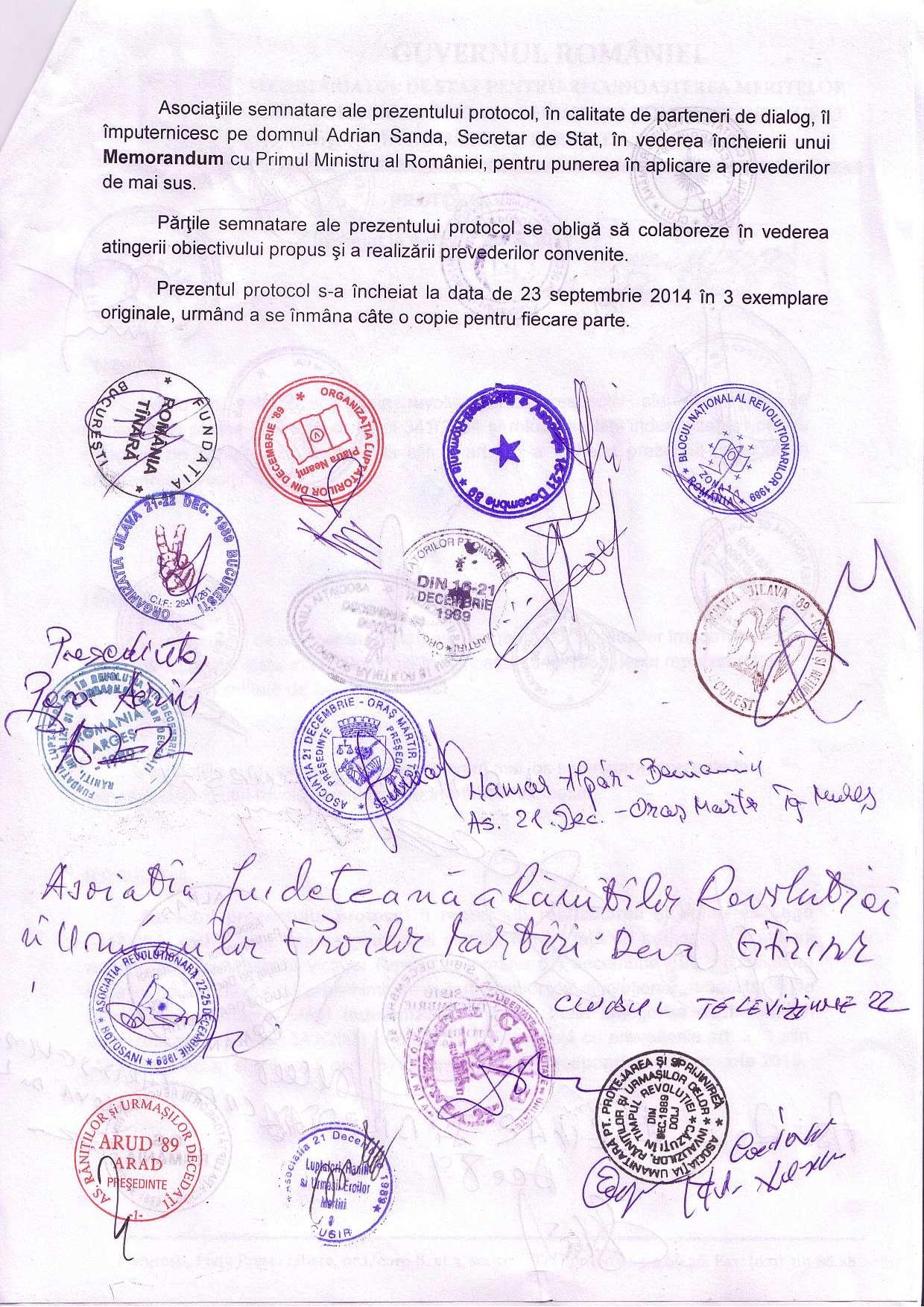 Pentru a rezolva solicitările revoluţionarilor Secretarul de Stat a propus încheierea unui Memorandum cu Primul Ministru al României, prin care să fie garantată reluarea plăţii indemnizaţiilor pentru categoria de beneficiari prevăzută la alin.4, art.4, începând cu 01 ianuarie 2015, prin cuprinderea în Bugetul de Stat a sumelor necesare şi pentru punerea în aplicare a tuturor punctelor discutate cu ocazia întrunirii Colegiului consultativ al revoluţionarilor. De asemenea, în vederea aducerii la îndeplinire a obiectivelor menţionate, Secretarul de stat a propus încheierea unui Protocol între Secretariatul de stat pentru recunoaşterea meritelor luptătorilor împotriva regimului comunist instaurat în România în perioada 1945-1989 şi reprezentanţii asociaţiilor şi organizaţiilor de revoluţionari prezente, act care trebuie să stea la baza Memorandumului menţionat.