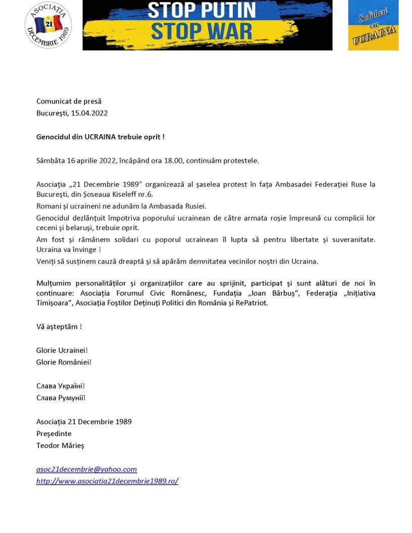 Asociația „21 Decembrie 1989” organizează al șaselea protest în fața Ambasadei Federației Ruse la București, din Șoseaua Kiseleff nr.6.
