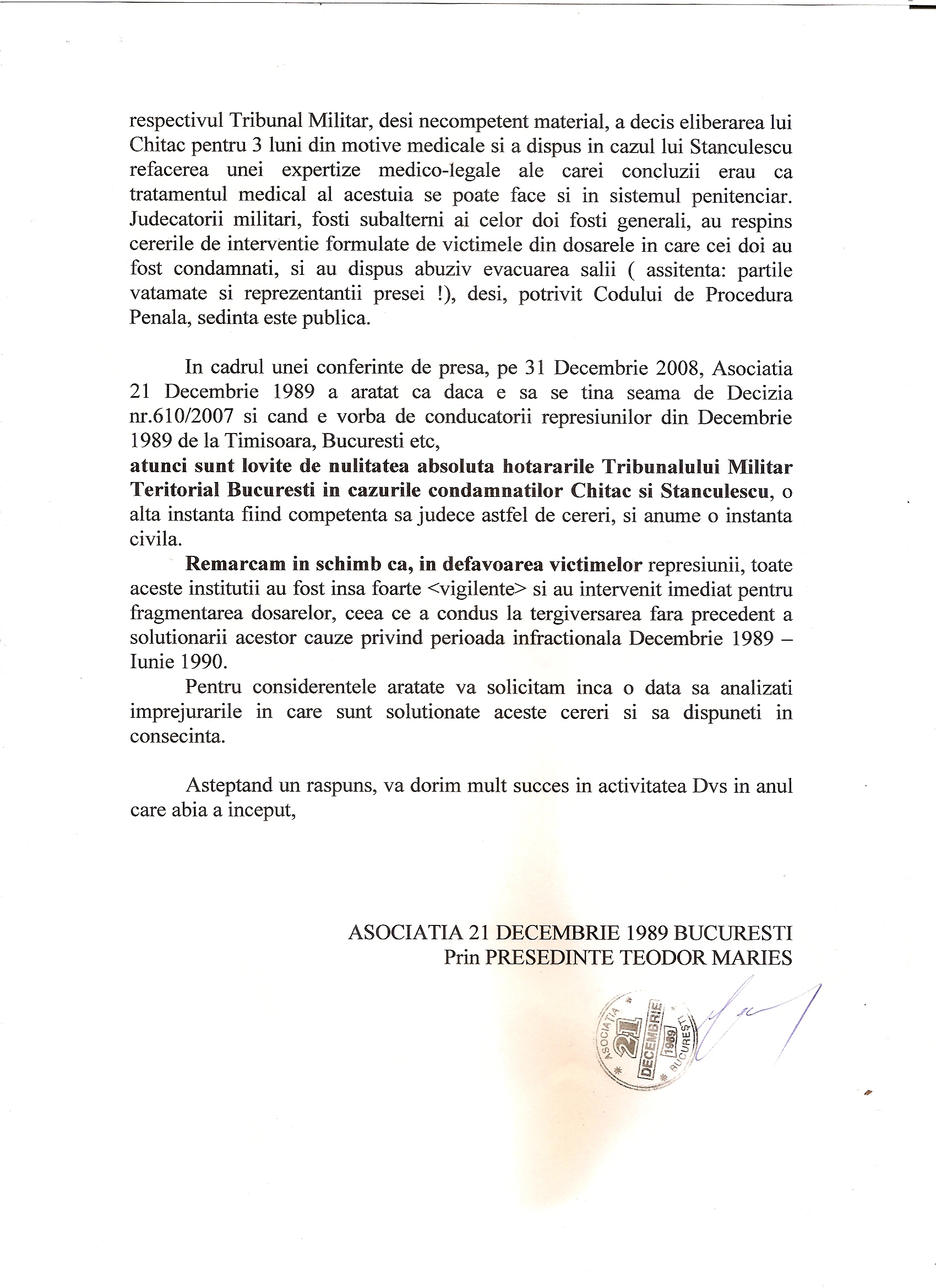 CĂTRE PROCURORUL GENERAL AL ROMÂNIEI 07/01/200915/03/2009 SESIZARE ← Dosarul Revoluţia 1989 CĂTRE CONSILIUL SUPERIOR AL MAGISTRATURII →