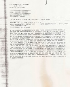 Notă informativă a M.I. de urmărirea lui Teodor Mărieş în perioada Pieţei Universităţii,