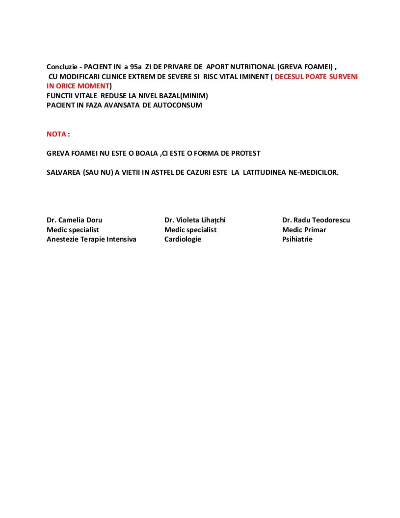 Sunteti deplin responsabili de viata acestui om, pentru care noi medicii nu putem face nimic, dar pe care domniile voastre il lasati sa moara. Va transmitem ultimul buletin medical, de ieri 23 februarie 2012.