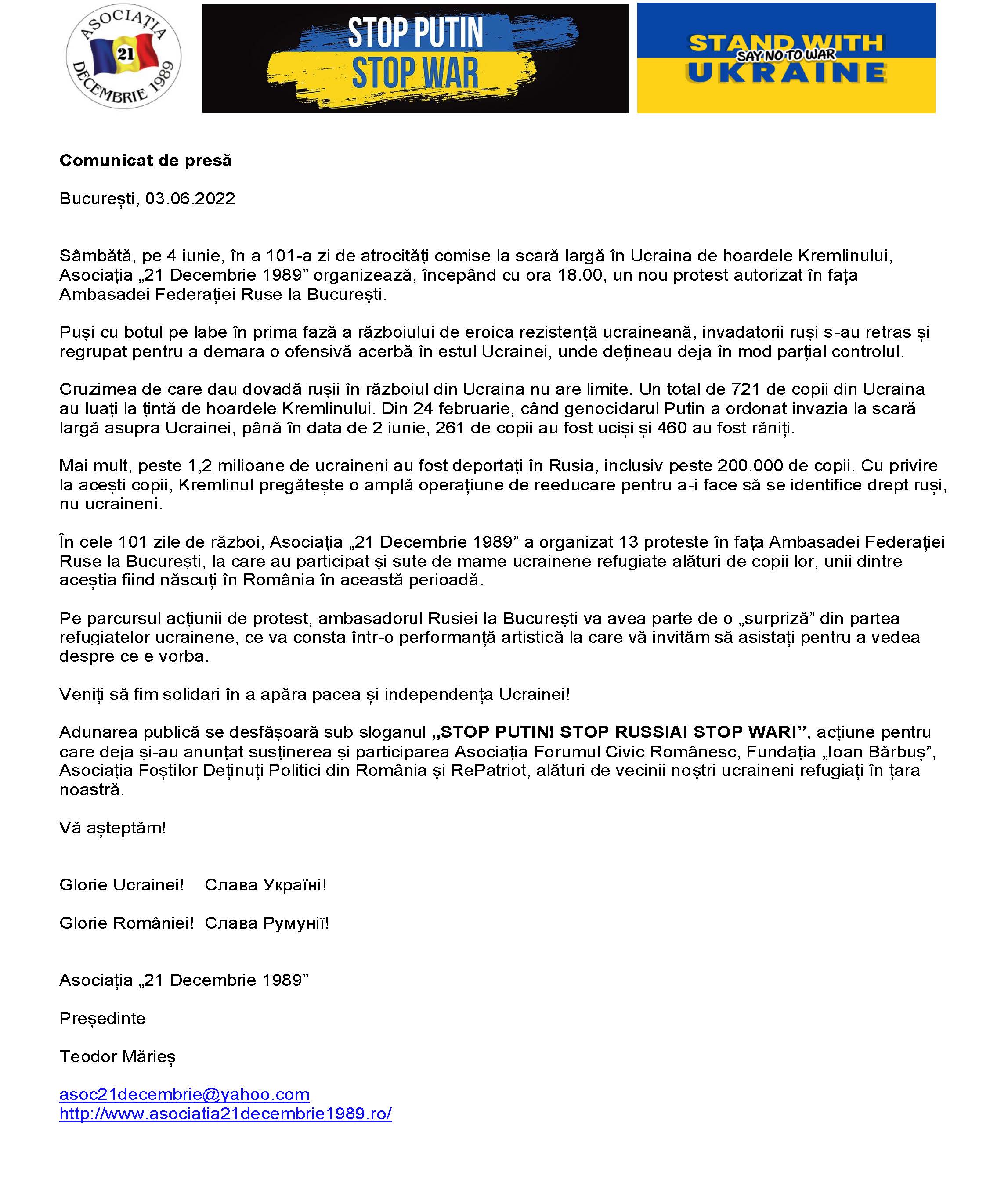 Sâmbătă, pe 4 iunie, în a 101-a zi de atrocități comise la scară largă în Ucraina de hoardele Kremlinului, Asociația „21 Decembrie 1989” organizează, începând cu ora 18, un nou protest autorizat în fața Ambasadei Federației Ruse la București.