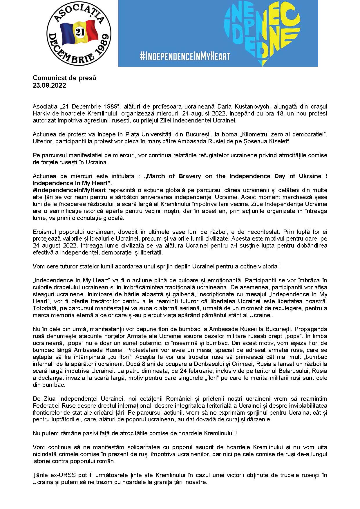 Asociația „21 Decembrie 1989”, alături de profesoara ucraineană Daria Kustanovych, alungată din orașul Harkiv de hoardele Kremlinului, organizează miercuri, 24 august 2022, începând cu ora 18, un nou protest autorizat împotriva agresiunii rusești, cu prilejul Zilei Independenței Ucrainei.