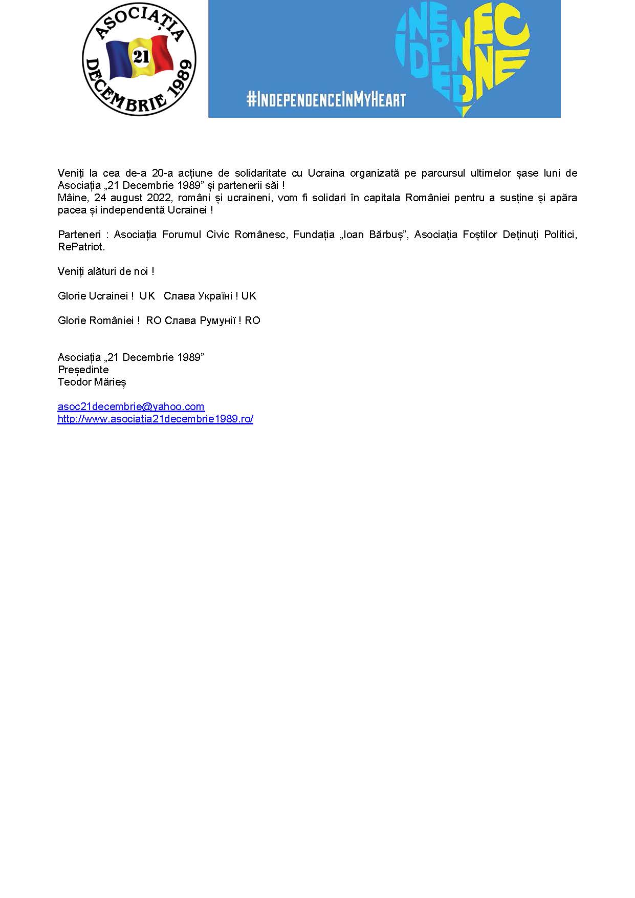 Mâine, 24 august 2022, români și ucraineni, vom fi solidari în capitala României pentru a susține și apăra pacea și independentă Ucrainei !